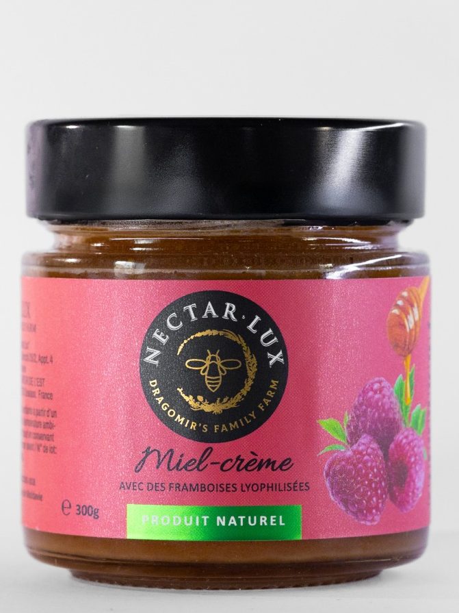 Ingrédients : 94 % miel naturel non pasteurisé, 6 % framboises lyophilisées.