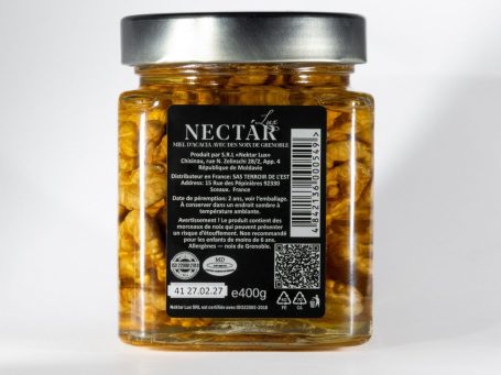 Ingrédients : 60 % miel d’acacia, 40 % cerneaux de noix.